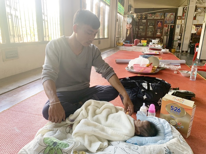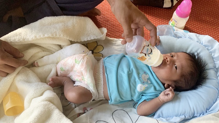 เมื่อเวลา 10.00 น. วันที่ 12 พ.ย.68 ผู้สื่อข่าวเดินทางไปที่ “วัดท่าตะคร้อเขาทอง” ม.5 ต.เทพนคร อ.เมือง จ.กำแพงเพชร โดยไปพบกับ “นายทศพร พรมจันทร์” (กุ้ง) อายุ 30 ปี (อยู่บ้านเลขที่ 577 หมู่ 7 ต.หนองปลิง อ.เมือง จ.กำแพงเพชร) กำลังให้นมลูกชาย ชื่อ ด.ช.ธนพร พรมจันทร์ (อยู่กับแม่) “น้องใบบุญ“ เด็กทารกอายุเพียง 27 วัน โดยผู้เป็นภรรยาได้คลอดลูกที่โรงพยาบาลคลองขลุง เมื่อวันที่ 16 ต.ค.68 ที่ผ่านมา จากนั้นเด็กมีร่างกายที่ไม่สมบูรณ์แพทย์จึงส่งตัวไปเข้าตู้อบที่โรงพยาบาลกำแพงเพชร และขาด้านขวาของเด็กมีลักษณะโก่งงอจึงได้ทำการใส่เฝือกให้ จนร่างกายเด็กแข็งแรงขึ้นหมอจึงให้กลับมาพักที่บ้าน ซึ่งในระหว่างอยู่โรงพยาบาลภรรยาของตน (แม่เด็ก) ได้ทิ้งลูกและหนีไปปล่อยให้ตนเลี้ยงเพียงลำพังเป็นพ่อเลี้ยงเดี่ยว ซึ่งตอนนี้ตนเองตกงาน ทำให้ลำบากไม่มีเงินที่จะซื้อผ้าอ้อมและนมให้ลูกกิน โชคดีที่หลวงพ่อเจ้าอาวาสวัดท่านเมตตาให้ข้าวก้นบาตรให้ตนกินและที่พักอาศัยในวัด และให้ปัจจัยไปซื้อนมพงมาชงให้ลูกกิน ยามลูกหลับตนก็ไปล้างจาน กวาดลานวัดเพื่อเป็นการตอบแทน โดยจากนี้คงต้องดูแลลูกให้แข็งแรงอีกนิดและหางานทำเพื่อนำเงินมาซื้อนมเลี้ยงลูก