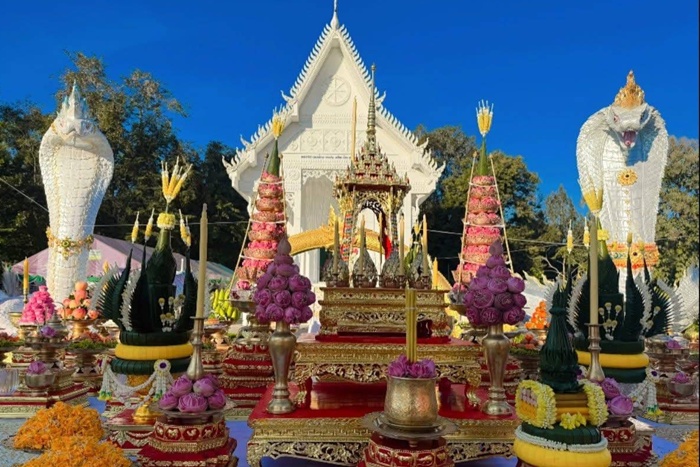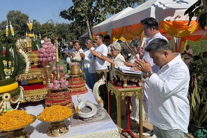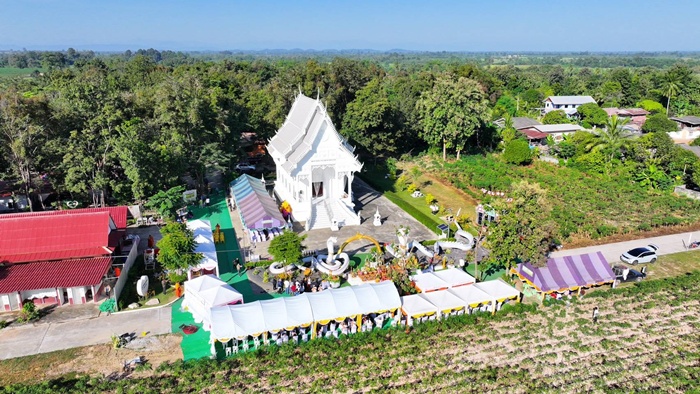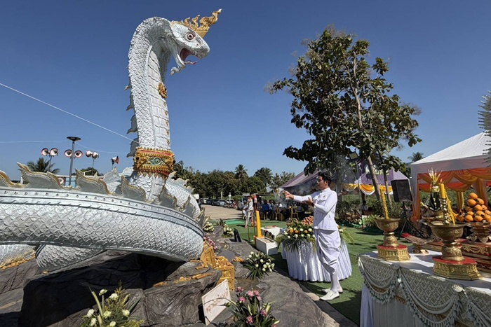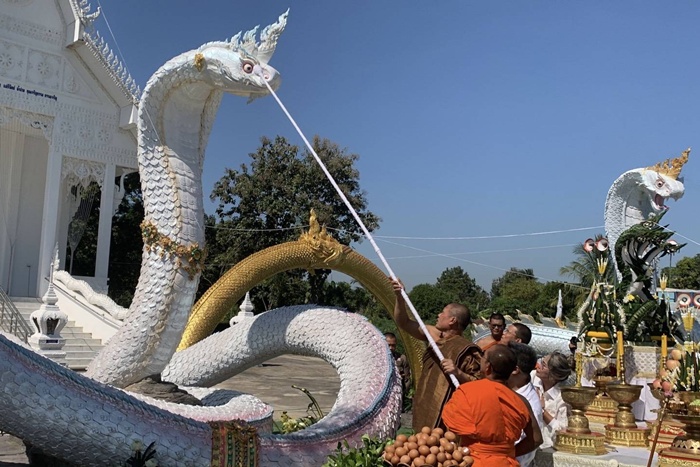 เมื่อเวลา 09.00 น.วันที่ 29 พ.ย.68 ที่ วัดหนองกระทุ่มใหม่ ม.4 (บ้านหนองกระทุ่ม) ต.วังชะพลู อ.ขาณุวรลักษบุรี จ.กำแพงเพชร ชาวบ้านและคณะศรัทธาต่างเดินทางมาร่วมพิธีบวงสรวงเบิกเนตรองค์พญานาคคู่หน้าอุโบสถสีขาวภายในวัด ซึ่งองค์พญานาคทั้ง 2 มีสีขาวนวลสวยงาม มีชื่อว่า “พญาพิณทโยนาควตี - แม่เกศมณีนาคเทวี” (พิน-ทะ-โย-นา-คะ-วะ-ตี ,เกต-มะ-นี-นาค-เท-วี) มีความยาว 50 เมตร สูง 5 เมตร สร้างขึ้นเมื่อวันที่ 12 เมษายน 2568 โดยลูกศิยษ์วัดแห่งนี้ได้ไปกราบไหว้ขอพรพญานาคที่วัดป่าปากโดม จ.อุบลราชธานี ขอให้กิจการรับเหมาก่อสร้างบ้านที่ทำอยู่เจริญรุ่งเรืองกว่าเดิม หากเป็นดังคำอธิฐานจะมาสร้างพญานาคให้ประชาชนผู้ศรัทธาได้กราบไหว้ไว้ที่วัดในอำเภอที่ตนอาศัย ซึ่งก็สำเร็จจริงตามคำขอพรจึงได้ทำการสร้างจนแล้วเสร็จภายใน 7 เดือน และได้ประกอบพิธีบวงสรวงในวันนี้
