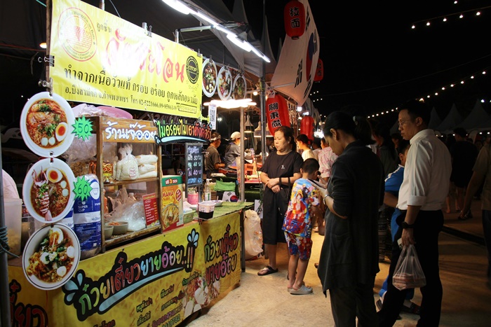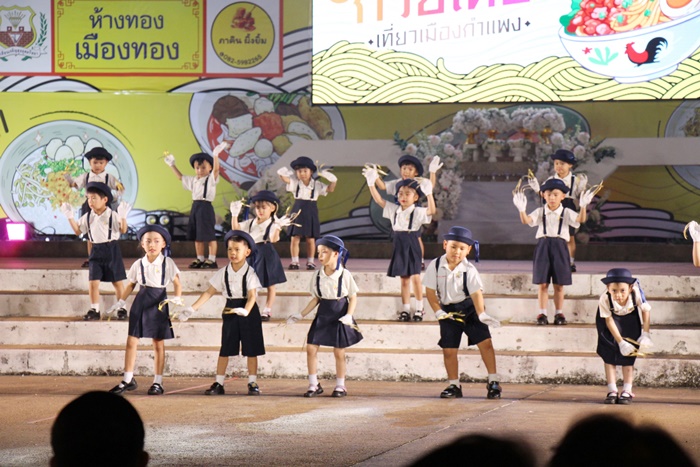 การแสดงที่หลากหลายและน่าจับตา น้องๆ นักเรียนได้สลับกันขึ้นเวทีนำเสนอการแสดงถึงความหลากหลายทางวัฒนธรรมและทักษะที่ได้รับการฝึกฝนมาเป็นอย่างดี โดยการแสดงชุดพิเศษที่ถ่ายทอดเรื่องราวของ “เส้น” อาหารที่เชื่อมโยงผู้คนทั่วโลกเข้าด้วยกัน “อาหารประเภทเส้น” ซึ่งมีอยู่ในหลากหลายวัฒนธรรมทั่วโลก ไม่ว่าจะเป็น เส้นก๋วยเตี๋ยวของไทย บะหมี่จีน ราเมนญี่ปุ่น หรือพาสต้าของอิตาลี แต่ละชาติยกให้ “เส้น” เป็นสัญลักษณ์แห่งความยาวนาน ความรัก ความกลมเกลียว และความสามัคคี จิตวิญญาณเดียวกัน การแสดงชุดนี้จึงไม่เพียงสะท้อนความอร่อยของอาหารขึ้นชื่ออย่าง “ก๋วยเตี๋ยวกำแพงเพชร” เท่านั้น แต่ยังเป็นบทบันทึกแห่งวัฒนธรรม ความหมาย และคุณค่าที่เชื่อมผู้คนเข้าด้วยกัน ทั้งในระดับท้องถิ่น ระดับชาติ และระดับนานาชาติ อันสมกับเจตนารมณ์ของงานเทศกาลที่ต้องการให้ผู้ร่วมงาน “อิ่มท้อง อิ่มใจ และอิ่มวัฒนธรรม” ไปพร้อมกัน ซึ่งการแสดงประกอบเพลงของนักเรียนในชุดเครื่องแบบของโรงเรียนก็ไม่น้อยหน้า ออกลีลาการเต้นประกอบเพลงอย่างมั่นใจและน่ารัก สร้างความประทึกใจให้กับผู้ชม โดยมีนายชาธิป รุจนเสรี ผู้ว่าราชการจังหวัดกำแพงเพชร เป็นประธานเปิดงาน มี ดร.ธิติ มหบุญพาชัย ประธานหอการค้าจังหวัดกำแพงเพชร กล่าวรายงาน และมีแขกผู้มีเกียรติ นายกเหล่ากาชาดจังหวัดกำแพงเพชร ส่วนราชการ ภาคเอกชน มูลนิธิ ประชาชน พ่อค้าแม่ค้า กลุ่มผู้ประกอบการรุ่นใหม่ YEC หอการค้าจังหวัดกำแพงเพชร ร่วมกิจกรรมอย่างพร้อมเพียง