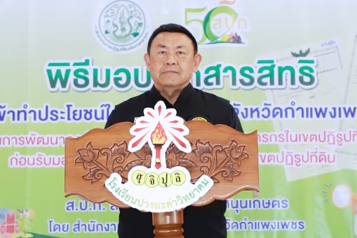 ในการนี้ นายชาธิป รุจนเสรี ผู้ว่าราชการจังหวัดกำแพงเพชร ได้มอบหมายให้ นายอนุชา พัสถาน รองผู้ว่าราชการจังหวัดกำแพงเพชร ให้การต้อนรับ พร้อมด้วย นายศิลา ละเภท ปฏิรูปที่ดินจังหวัดกำแพงเพชร เป็นผู้กล่าวรายงานถึงวัตถุประสงค์ของการจัดงาน โดยมีคณะผู้บริหาร ส.ป.ก. , หัวหน้าส่วนราชการและผู้แทนหน่วยงานระดับจังหวัด อำเภอ ผู้นำองค์กรปกครองส่วนท้องถิ่นในพื้นที่ร่วมเป็นเกียรติ พร้อมด้วยพี่น้องเกษตรกรในพื้นที่อำเภอขาณุวรลักษบุรี เข้าร่วมกิจกรรมและรับมอบโฉนดที่ดินเพื่อการเกษตร จำนวน 300 ราย
