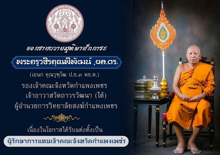 พระครูวชิรคุณพิพัฒน์,ผศ.ดร. รองเจ้าคณะจังหวัดกำแพงเพชร เจ้าอาวาสวัดถาวรวัฒนา(ใต้) ตำบลถาวรวัฒนา อำเภอทรายทองวัฒนา จังหวัดกำแพงเพชร ผู้อำนวยการวิทยาลัยสงฆ์กำแพงเพชร รับคำสั่งตราตั้งผู้รักษาการแทนเจ้าคณะจังหวัดกำแพงเพชร จากพระพรหมวัชรวิสุทธิ์ เจ้าคณะภาค 4 เจ้าอาวาสวัดคูยาง พระอารามหลวง ตำบลในเมือง อำเภอเมือง กำแพงเพชร