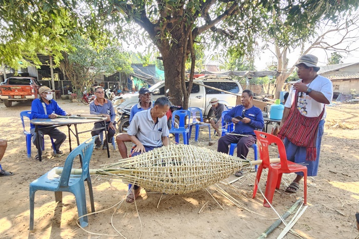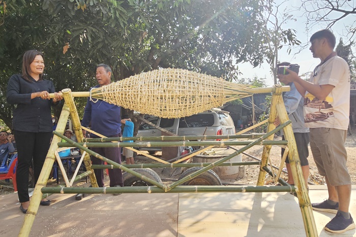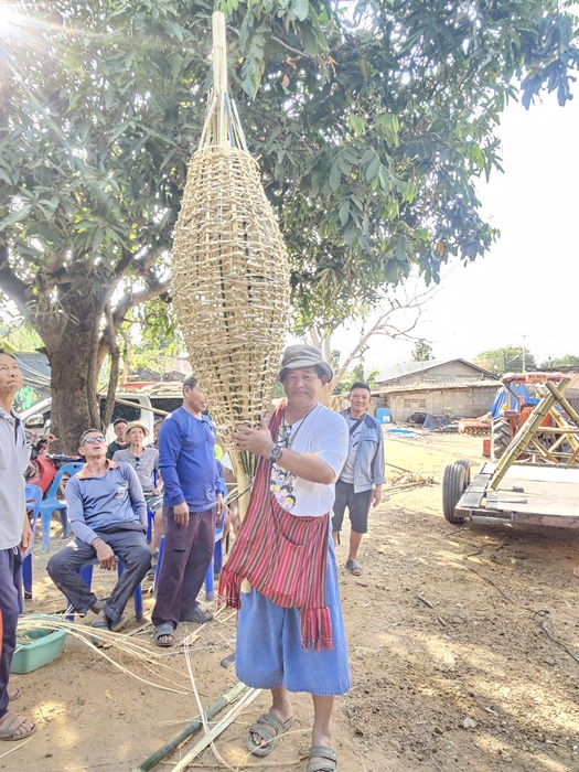 นอกจากความอ่อนช้อยของ ตุงใยแมงมุม ที่แขวนเรียงรายแล้ว อีกหนึ่งที่สร้างความตื่นตาตื่นใจคือการร่วมแรงร่วมใจของกลุ่มชาวบ้านชายผู้สูงอายุ ที่กำลังช่วยกันนำไม้ไผ่มาเหลาและจักสานอย่างประณีต เพื่อประกอบเป็นโครงสร้างของ "ข้าวจี่ยักษ์" ใช้ไม้ไผ่สานขัดกันจนเป็นรูปทรงรีคล้ายข้าวจี่ขนาดใหญ่ มีความแข็งแรง ข้าวจี่เป็นอาหารพื้นบ้านที่สะท้อนถึงวิถีเกษตรกรรมและความผูกพันกับข้าวเหนียว การทำข้าวจี่ขนาดใหญ่จึงสื่อถึงความอุดมสมบูรณ์ของพืชพันธุ์ธัญญาหารในชุมชน เมื่อโครงสร้างเสร็จสมบูรณ์ จะมีการตกแต่งรายละเอียดให้เสมือนจริง เพื่อใช้เป็นเครื่องประกอบในขบวนแห่และจัดตั้งโชว์ภายในบริเวณงานวัด การประดิษฐ์ทั้งตุงใยแมงมุมและข้าวจี่ยักษ์ในครั้งนี้ เป็นภาพลักษณ์ของชาวหมู่บ้านศรีโยธิน ในฐานะชุมชนที่เข้มแข็งด้านการอนุรักษ์วัฒนธรรม โดยได้รับการสนับสนุนให้เป็น ประเพณีท้องถิ่นของจังหวัดกำแพงเพชร และเทศบาลเมืองหนองปลิง บรรยากาศการทำงานเต็มไปด้วยความสนุกสนาน ชาวบ้านแบ่งหน้าที่กันตามความถนัด ฝ่ายหญิงเน้นงานประณีตในการพันเส้นด้ายทำตุง ส่วนฝ่ายชายเน้นงานฝีมือเชิงช่างในการสานโครงสร้างขนาดใหญ่