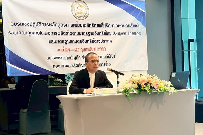 วันที่ 24-27 กุมภาพันธ์ 2569 นายสันติ ไชยา ผู้อำนวยการศูนย์เมล็ดพันธุ์ข้าวกำแพงเพชร มอบหมายให้นางสาวสุชีรา สงพูล นักวิชาการเกษตรปฏิบัติการ เข้าร่วมการอบรมเชิงปฏิบัติการหลักสูตร “การเพิ่มประสิทธิภาพที่ปรึกษาเกษตรกรสำหรับระบบควบคุมภายใน” เพื่อการผลิตข้าวตามมาตรฐานเกษตรอินทรีย์ไทย (Organic Thailand) และมาตรฐานเกษตรอินทรีย์ต่างประเทศ ณ โรงแรมแอทที บูทีค จังหวัดประจวบคีรีขันธ์ โดยมีนายกฤษฎิน คำตัน รองอธิบดีกรมการข้าว เป็นประธานเปิดการอบรมฯ ซึ่งมีวัตถุประสงค์เพื่อถ่ายทอดองค์ความรู้ด้านมาตรฐานเกษตรอินทรีย์ ทั้งในประเทศและต่างประเทศ พร้อมเตรียมความพร้อมบุคลากรให้สามารถทำหน้าที่เป็นที่ปรึกษาระบบควบคุมภายในสำหรับกลุ่มเกษตรกรได้อย่างมีประสิทธิภาพ รองรับการขยายตัวของตลาดข้าวอินทรีย์ทั้งในและต่างประเทศ
