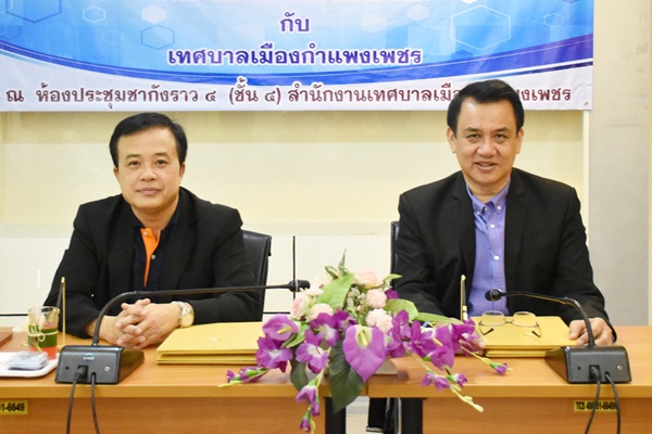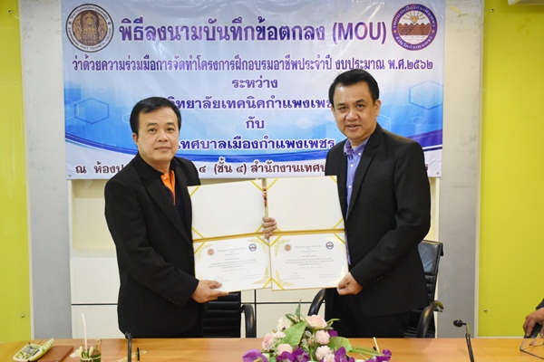 เมื่อวันที่ 27 ธันวาคม 2561 เวลา 11.00 น. ณ ห้องระชุมชากังราว 4 ชั้น 4 สำนักงานเทศบาลเมืองกำแพงเพชร นายชัยวัฒน์ ศุภอรรถพานิช นายกเทศมนตรีเมืองกำแพงเพชร ร่วมลงนามบันทึกข้อตกลง (MOU) ว่าด้วยความร่วมมือจัดทำโครงการส่งเสริมอาชีพสำหรับประชาชน ประจำปีงบประมาณ พ.ศ.2562 กับ นายทองคำ ตินะลา ผู้อำนวยการวิทยาลัยเทคนิคกำแพงเพชร ร่วมด้วย นายนพพร ปานชัย รองนายกเทศมนตรีเมืองกำแพงเพชร นายปริญญา เหล่าวชิรวงศ์ เลขานุการนายกเทศมนตรีฯ นายเฉลิมพล เพชรเฉิดฉิน ที่ปรึกษานายกเทศมนตรีฯ และสมาชิกสภาเทศบาลฯหัวหน้าส่วนการงานเข้าร่วมในพิธีในครั้งนี้