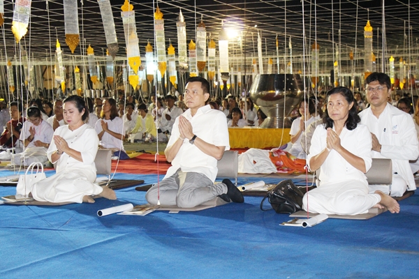 เริ่มต้นจากประธานจุดเทียนธูปบูชาพระรัตนตรัย และพระราชวชิรเมธี ดร. เจ้าอาวาสวัดพระบรมธาตุ พระอารามหลวง รองเจ้าคณะจังหวัด ประธานฝ่ายสงฆ์ โดยในพิธีทางวัดได้ผูกโยงด้ายสายสิน จากองค์พระบรมธาตุเจดีย์ ซึ่งเป็นที่เคารพสักการะของชาวกำแพงเพชร ขึงรอบบริเวณ และปล่อยชายสายสินห้อยลง เพื่อให้ประชาชนที่มาสวดมนต์ได้นำไปคล้องศีรษะ