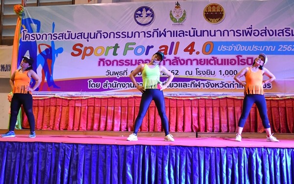 สำนักงานการท่องเที่ยวและกีฬาจังหวัดกำแพงเพชร จึงได้จัดโครงการสนับสนุนกิจกรรมการกีฬาและนันทนาการเพื่อส่งเสริมคุณภาพชีวิต 4.0 (Sport For all 4.0) ในวันนี้จัดให้มีการถ่ายทอดสดผ่าน Facebook Live ของสำนักงานการท่องเที่ยวและกีฬาจังหวัดกำแพงเพชร เพื่อแสดงให้เห็นว่าพี่น้องประชาชนในพื้นที่ทุกหมู่เหล่าให้ความสำคัญในการดูแลสุขภาพด้วยการออกกำลังกาย กลุ่มเป้าหมายประกอบไปด้วย หัวหน้าส่วนราชการพร้อมข้าราชการ เจ้าหน้าที่เด็ก นักเรียน จากสถานศึกษาต่างๆ อาสาสมัครสาธารณสุขประจำหมู่บ้าน ชมรมผู้สูงอายุ ชมรมรักษ์การออกกำลังกายในพื้นที่ เข้าร่วมในวันนี้ ประมาณ 500 คน