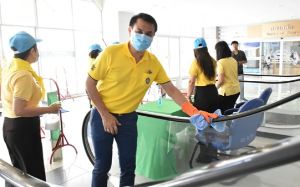 4.บริเวณระเบียงอาคารสำนักงานบริเวณระเบียงและพื้นผิวอาคารฝั่งด้านทางเข้า มอบกองช่างและฝ่ายปกครองร่วมกันทำความสะอาด ก็บกวาด ล้ง และฉีดพ่นยาฆ่าเชื้อโรค