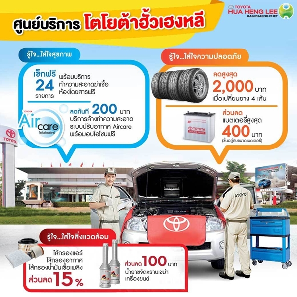 ด้วยความห่วงใยจาก บริษัท โตโยต้ากำแพงเพชร (ฮั้วเฮงหลี) จำกัด สำหรับลูกค้าที่ใช้รถยนต์โตโยต้าทุกรุ่น เมื่อนำรถเข้ารับบริการศูนย์บริการโตโยต้าฮั้วเฮงหลี รับโปรโมชั่นสุดพิเศษ