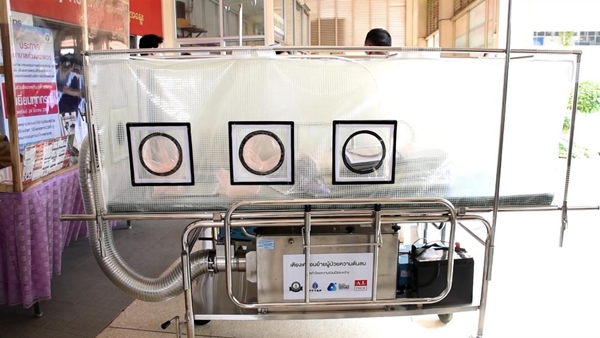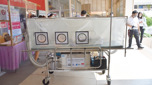 สำหรับเตียงเคลื่อนย้ายผู้ป่วยความดันลบ และกล่องทำหัตถการแรงดันลบ เป็นนวัตกรรมที่นำต้นแบบมาจากเตียงเคลื่อนย้ายผู้ป่วยติดเชื้อแบบแรงดันลบของคณะแพทยศาสตร์วชิรพยาบาล โดย ปตท.สผ. และ บริษัท เอไอ แอนด์ โรโบติกส์ เวนเจอร์ส จำกัด (เออาร์วี) ซึ่งเป็นบริษัทในเครือ ได้ร่วมกับบริษัท เอ.ไอ.เทคโนโลยี จำกัด ใช้องค์ความรู้ทางด้านวิศวกรรมเข้าไปต่อยอด โดยเพิ่มประสิทธิภาพของเครื่องให้สามารถทำงานได้ถึง 3 หน้าที่ในเครื่องเดียวกัน คือ ปรับแรงดันอากาศให้เป็นลบ กรองเชื้อโรค และฆ่าเชื้อโรคด้วยรังสียูวีซี (UV-C) รวมทั้ง ได้พัฒนาเครื่องกำเนิดแรงดันลบแบบเคลื่อนที่ ซึ่งนำไปติดตั้งร่วมกับกล่องทำหัตถการ ทำให้การควบคุมเชื้อขณะรักษาคนไข้มีประสิทธิภาพมากยิ่งขึ้น สามารถลดความเสี่ยงต่อการติดเชื้อให้กับบุคลากรทางการแพทย์ขณะเคลื่อนย้ายผู้ป่วย และระหว่างการตรวจรักษาผู้ป่วยติดเชื้อโควิด-19