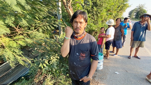 นายประดิษฐ์ วงษ์จันทร์ อายุ 44 ปี เล่าว่า "ตนเองมีอาชีพรับเหมาก่อสร้าง กำลังเดินทางกลับจากตรวจงานในตัวเมืองกำแพงเพชร ขณะขับรถกลับบ้าน เมื่อถึงจุดดังกล่าว ตนเองกำลังจะขับรถแซงรถพ่วงไปเลนขวา ปรากฎว่ามีรถอีกฝั่งขับมาพอดี ตนเองจึงได้แตะแบรกและหักรถกลับมาเลนตนเองอย่างกระทันหัน แต่กลับจะชนเข้ากับท้ายรถพวงจึงได้เหยียบแบรกอีกครั้งจนรถเสียหลักหมุนจนตกลงไปในคูน้ำข้างทางโชคดีไม่ชนกับเสาไฟฟ้าและต้นไม้ ไม่งั้นคงจะไม่รอดแน่นอน